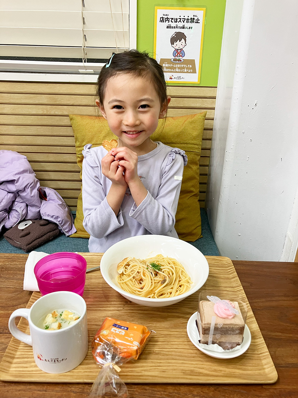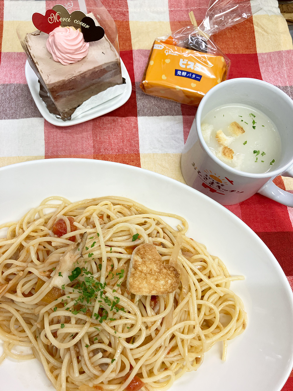 この日のメニューはきのこトマトパスタ、ポタージュに、スペシャルバレンタインケーキです。